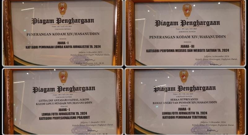 Berdasarkan hasil penilaian para juri, Pendam XIV/Hasanuddin berhasil meraih 2 (dua) gelar juara. Jelasnya, juara pertama kategori Pembinaan Lomba Karya Jurnalistik TA. 2024 dan juara ketiga kategori Performa Media Sosial (Medsos) dan Website Satuan TA. 2024.